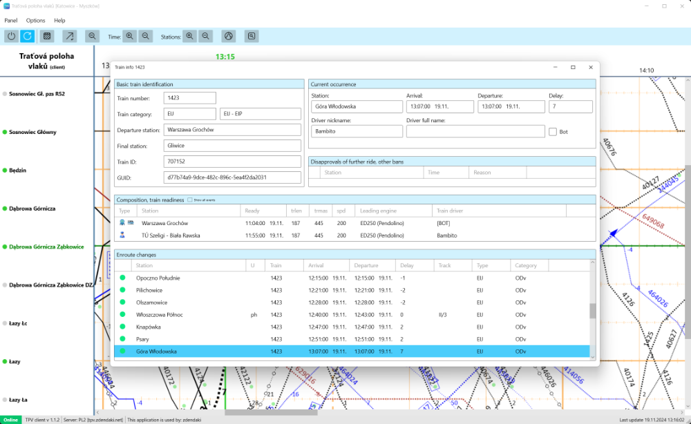 Train Position Viewer (TPV) application monitors SimRail servers in real time, acquires train positions and displays this data and much more in route graph.